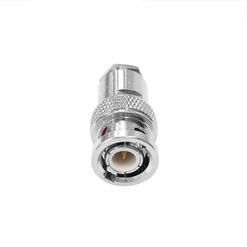 As a male interface (plug), it features the standard two-stud bayonet locking system for rapid, vibration-resistant mating with BNC jacks. Unlike standard crimp connectors, the clamp mechanism provides a high-pressure, uniform mechanical bond that ensures the integrity of the silver-plated shielding is maintained, resulting in excellent grounding and low signal leakage. Manufactured with a heavy-duty nickel-plated brass body and premium PTFE (Teflon) insulation, it delivers consistent 50-Ohm performance across high-stress industrial and telecommunications applications.