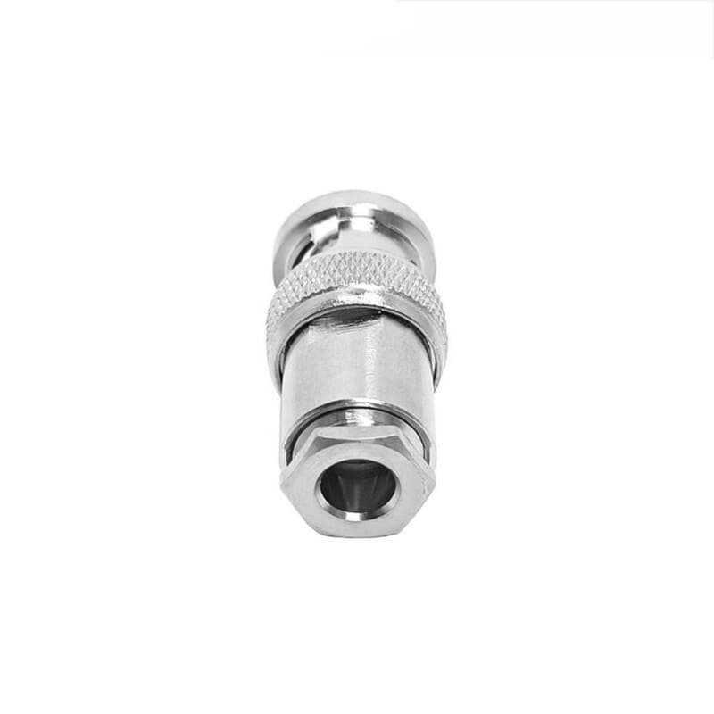As a male interface (plug), it features the classic two-stud bayonet locking system for rapid, vibration-resistant mating with BNC jacks. Unlike crimp connectors, the clamp termination provides a high-pressure mechanical bond that ensures excellent grounding and shielding effectiveness without the need for specialized crimping dies. Manufactured with a durable nickel-plated brass body and premium PTFE (Teflon) insulation, it delivers consistent 50-Ohm performance and reliable signal integrity across a wide range of telecommunications, broadcast, and industrial applications.