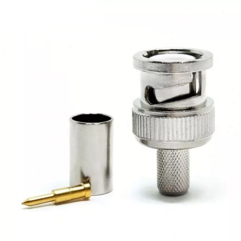 The BNC male crimp connector is a foundational RF component valued for its quick-connect/disconnect bayonet coupling and robust mechanical interface. This variant is specialized for the 6mm cable class, specifically optimized for standard RG59 coaxial cable, which is the industry standard for baseband video and CATV applications. As a male interface (plug), it features a precision center pin and a rugged housing designed for secure, vibration-resistant engagement with BNC jacks.