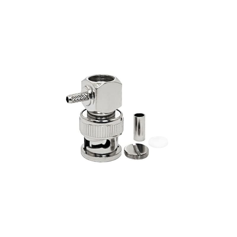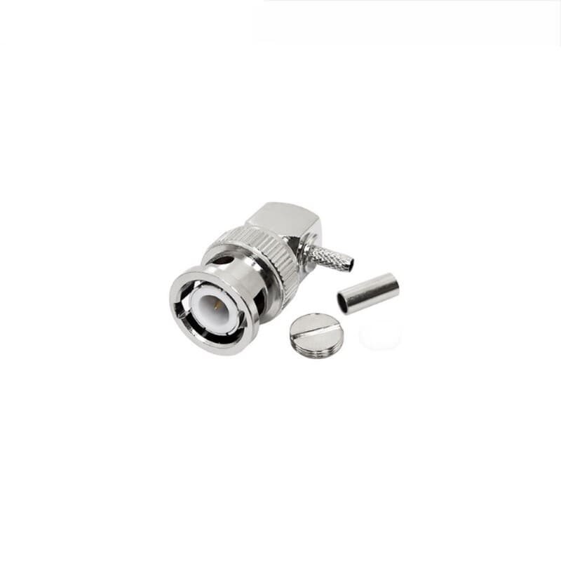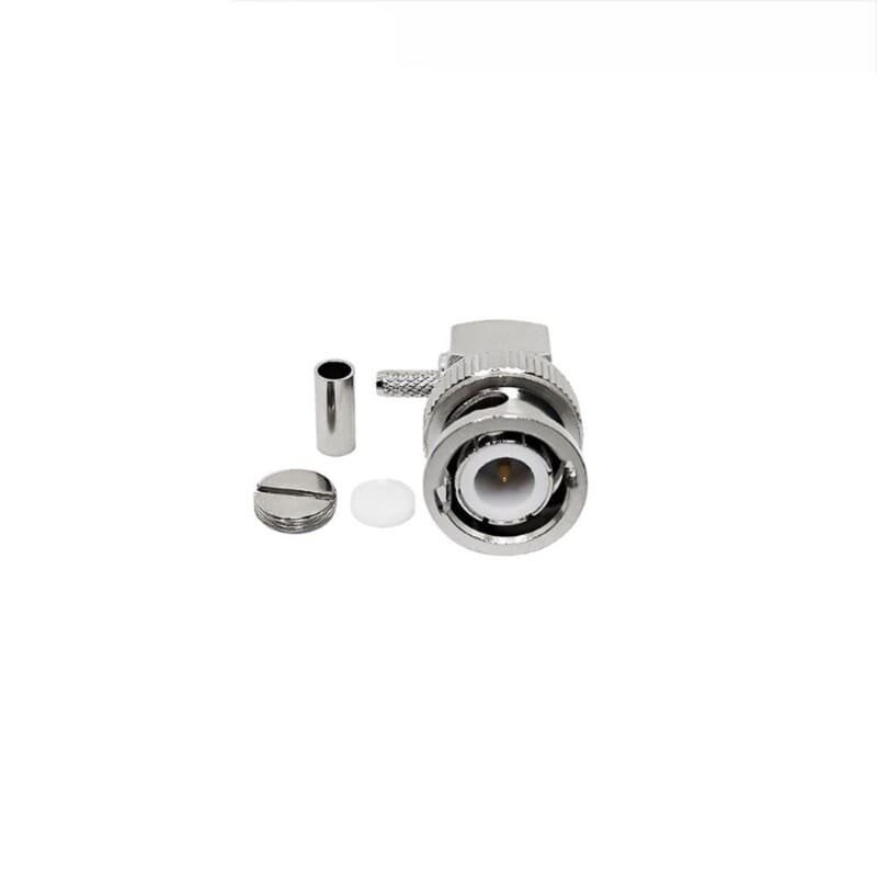 The BNC male right-angle crimp connector is a high-performance RF component valued for its space-saving design and robust mechanical interface. This variant features a 90-degree (Right Angle) body, allowing the cable to exit perpendicular to the mating axis. This configuration is specialized for the 2.5mm to 3mm cable class, specifically optimized for high-performance LMR100, flexible RG174, and high-temperature RG316. The right-angle orientation significantly reduces the depth required for connections, making it essential for shallow enclosures and high-density rack systems.