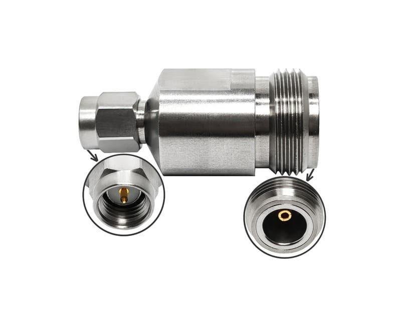N Female to SMA Male Interface: Consists of an N-Type Jack (with socket and external threads) and an SMA Plug (with center pin and hex coupling nut).
