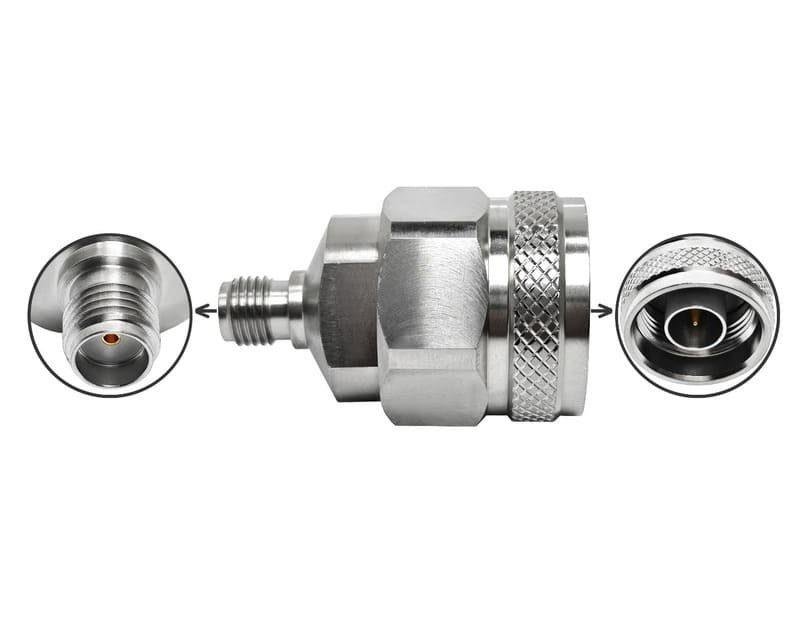 N Male to SMA Female Interface: Consists of an N-Type Plug (with center pin and hex coupling nut) and an SMA Jack (with socket and external threads).