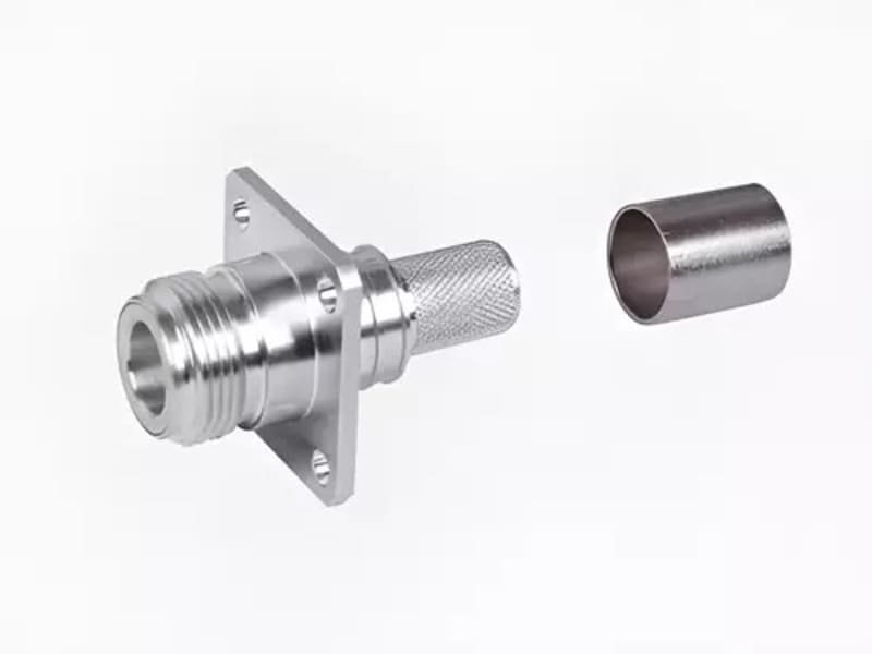 The N-Type female panel mount connector is a fundamental component for high-power RF interfacing, prized for its mechanical stability and superior grounding. This variant features a 4-hole square flange (4H), providing a robust mounting solution that prevents connector rotation and ensures maximum surface contact with the equipment chassis, which is essential for maintaining a low-impedance ground path. It is specialized for the 10mm (0.405″) cable class, specifically optimized for high-performance LMR400 and heavy-duty RG213.