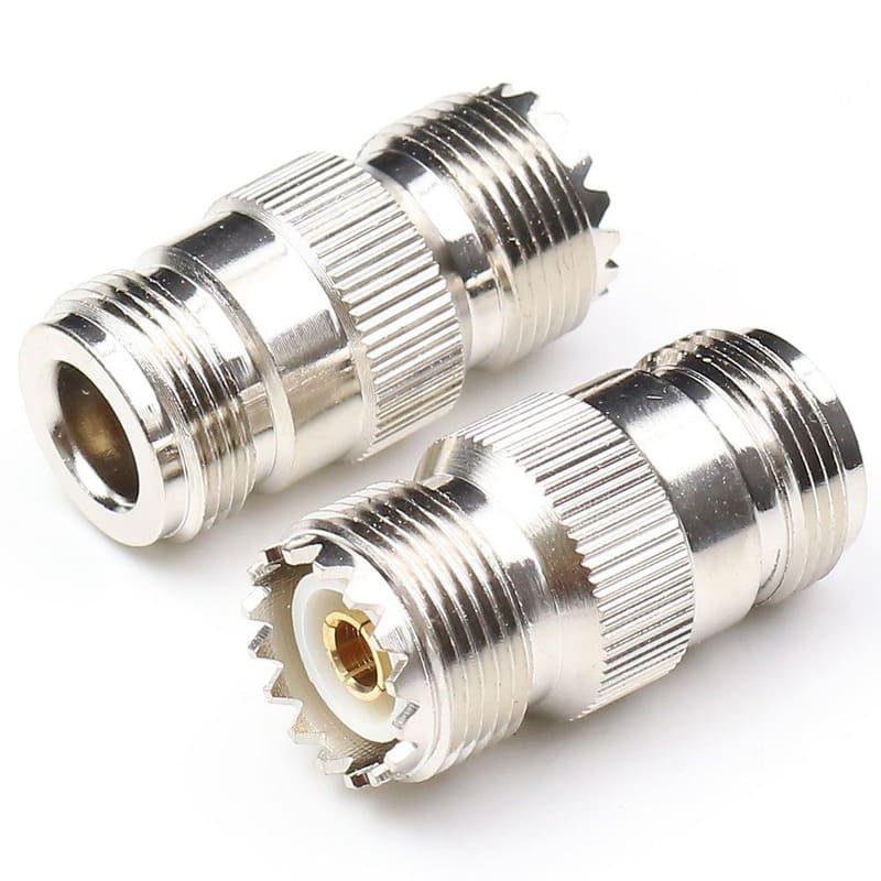 N Female to UHF Female Interface: Consists of an N-Type Jack (with socket and external threads) and a UHF Jack (with socket and external threads).