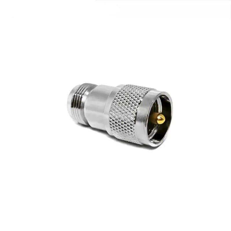 The N Female to UHF Male Adapter is a specialized “between-series” RF component designed to provide a high-reliability transition between the high-precision N-Type standard and the widely utilized UHF interface. It features an N-Type Jack (Female) on one side, utilizing the standard threaded interface common in professional wireless infrastructure, and a UHF Plug (Male/PL-259) on the other, featuring the classic large-format threaded coupling nut and center pin.