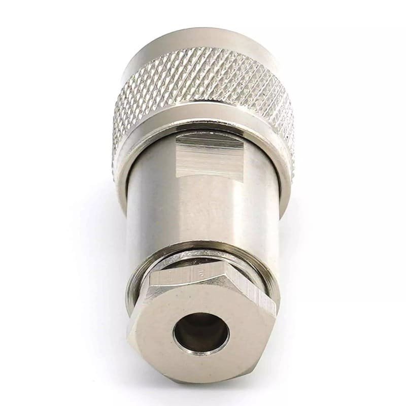 The clamp design is particularly advantageous for maintenance and repair in remote locations, as it eliminates the need for specialized ratcheting crimp tools. It ensures excellent electrical contact and grounding by applying uniform pressure across the cable’s outer conductor, making it ideal for high-vibration and outdoor environments. Manufactured with a heavy-duty nickel-plated brass body and premium PTFE (Teflon) insulation, it delivers consistent 50-Ohm performance and low VSWR up to 11 GHz. The 5/8-24 threaded interface provides superior mechanical stability and environmental resistance, making it essential for outdoor cellular towers, vehicle-mounted antennas, and marine RF infrastructure.